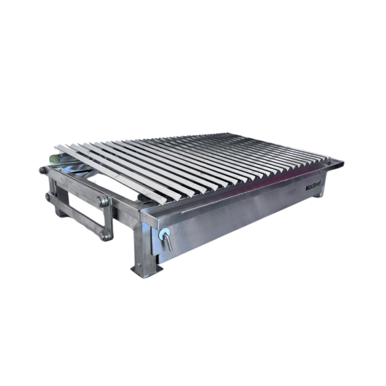 Si prefieres los cortes grasos y valoras la limpieza fácil, ésta es tu parrilla: módulos con perfiles en «V» que desembocan en un canal recolector de grasa, 100% acero inoxidable. Diseño robusto y funcional. Alzador frontal con perno de hilo cuadrado para precisión y resistencia.